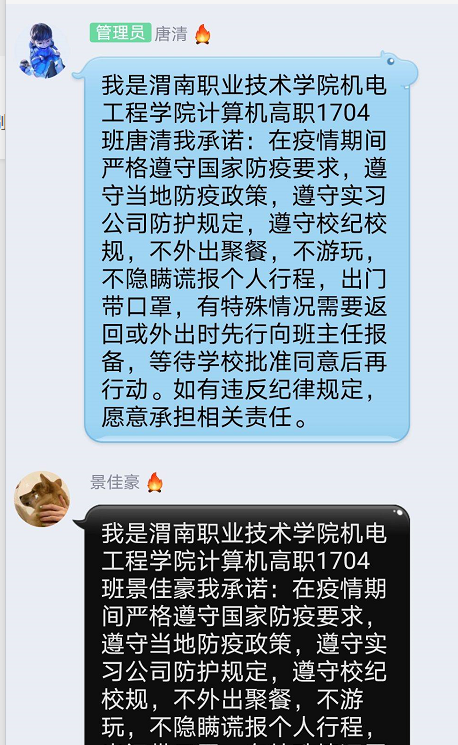针对员工管理在政策落实方面提出三点要求:一是疫情管理工作中,监控班级员工打卡,确保每日100%打卡及数据的真实性。所有的顶岗实习员工坚守不流动的原则,如有特殊情况,及时上报公司备案,获得相关指令后方可在岗位上异动。对于中高风险地区员工逐一进行思想教育,建立员工档案,引导员工严格遵守公司的疫情管理规定和企业的管控要求,不流动不走动,确保自己的生命安全。二是4月1日前完成17级线上主题班会召开。班会中要强调员工管理及纪律要求。开展思想教育工作,提升员工的思想认识,让员工真正领会当下疫情的严重性,理解国家及公司政策的背后价值与意义,要求员工严格遵守当下的疫情政策要求,跟踪每个员工完成自律承诺书,确保将公司的政策落到实处。三是本周内各班必须要开展线上家长会。鉴于在校生在家网课学习时间较长,思想容易出现松懈怠慢。除了在每周的班会上做好员工的心理疏导工作外,还要组织家长开展家长会,希望获得家长对员工学习的认可及支持,家校配合,共同做好疫情管理及线上教学。(撰稿:伟德bv国际体育官方网站 贺峰鸽 审核:盛君国)