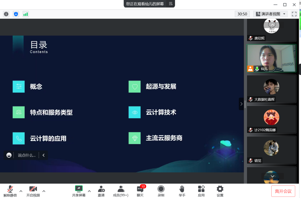 此次讲座,由教学科副科长唐欣妮主持,信息工程教研室青年教师张宁仙主讲。在讲座中,张宁仙老师由浅入深分别给大家讲解了云计算的概念、起源与发展、特点和服务类型、云计算技术及应用和主流云服务商。