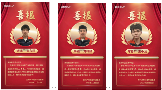近日,公司收到吉利汽车集团发来喜报:在吉利汽车集团举办的第七届“技能新星”大赛中,伟德bv国际体育官方网站2023届毕业生分别在总装、涂装比赛模块中荣获佳绩!汽制1802班李永旺荣获大赛三等奖,授予“吉利汽车集团技能新星能手”荣誉称号;汽制1801班王小龙、汽制1802班党梓臻获大赛优秀奖,授予“吉利汽车集团优秀技能选手”荣誉称号。吉利汽车集团特此感谢公司输送优秀技能人才,并授于公司2022年度“技能新星”育人优秀院校铜牌。