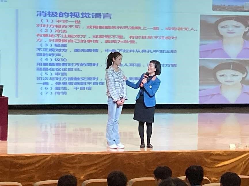 李主任围绕职场礼仪与形象设计,从礼仪概述、 职场礼仪、沟通礼仪、了解性教育等四个方面展开,为同学们细心讲解,并与同学们现场互动问答,让同学充分了解职场礼仪与形象设计得重要性,并与同学们分享自己多年的职场经验以及心得体会。
