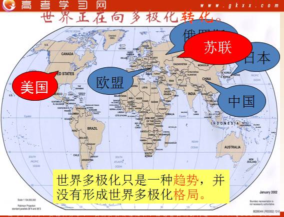 1.世界多极化是指世界政治多极化的格局。格局是现实力量的配置和组合,世界政治格局是以综合国力对比为基础的。世界多极化是指一定时期内对国际关系有突出影响的国家和国家集团相互作用而趋向于形成多极格局的一种发展趋势,是对主要政治力量在全球实力分布状态的一种反映。苏联解体标志两极格局的终结。当今世界政治体系中,有美国、欧盟、俄罗斯、日本、中国等国家和国家集团在国际事务中发挥越来越重要的作用。