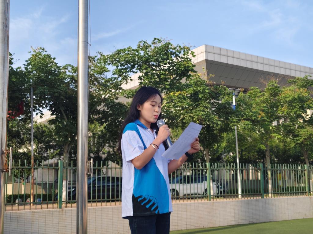 随着激昂的国歌响起,升旗手有力地扬起国旗,五星红旗缓缓升起,与旭日初升时倾洒的耀眼光芒相互辉映。在场师生齐声高唱国歌。那激昂的旋律回荡在校园上空,震撼着每一个人的心灵,唤起了大家内心深处对祖国的无限热爱与敬意。